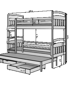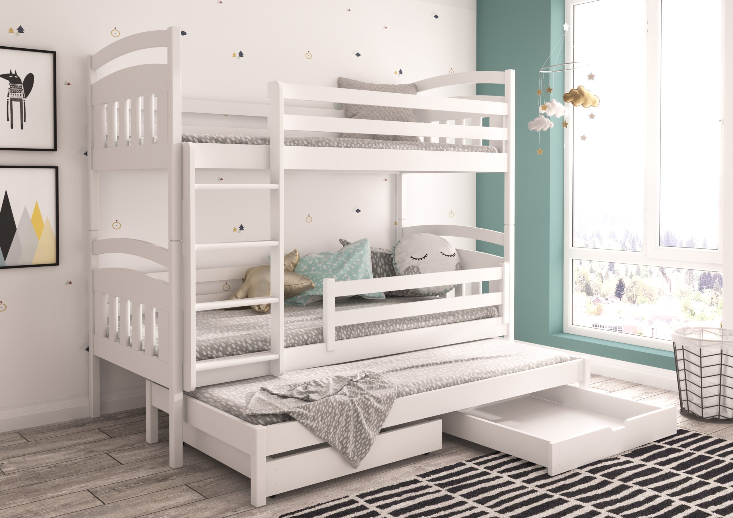 Az ALDO háromszemélyes emeletes ágy kiváló megoldás helymegtakarításra a kisgyermek szobákban. A bútor stabil lépcsőfokkal és védőkorlátokkal rendelkezik, amelyek szinte az ágykeret minden oldalán elhelyezkednek, így biztos lehet benne, hogy gyermekének teljes biztonságot nyújt alvás közben. Emellett az ágy alsó részén két tágas és funkcionalitású fiók található ágynemű tárolására. A matracok nem tartoznak az ágyhoz.
