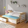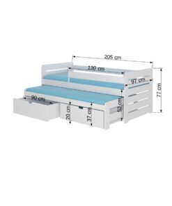 A TOMI kétágyas ágy korláttal ideális megoldás két testvér szobájába. Kiválóan alkalmas váratlan vendégek fogadására is. A modell két méretben és számos színben elérhető, ami minden berendezéshez passzol. Az ágy két praktikus és funkcionális ágyneműtartóval rendelkezik, valamint erős és masszív lucfenyőből készült vázszerkezettel. A gyermek biztonsága érdekében extra védőkorláttal is ellátták, ami megakadályozza a leesést. Az ágyhoz egy komplett, 8 cm vastag habmatracokból álló szett is tartozik.