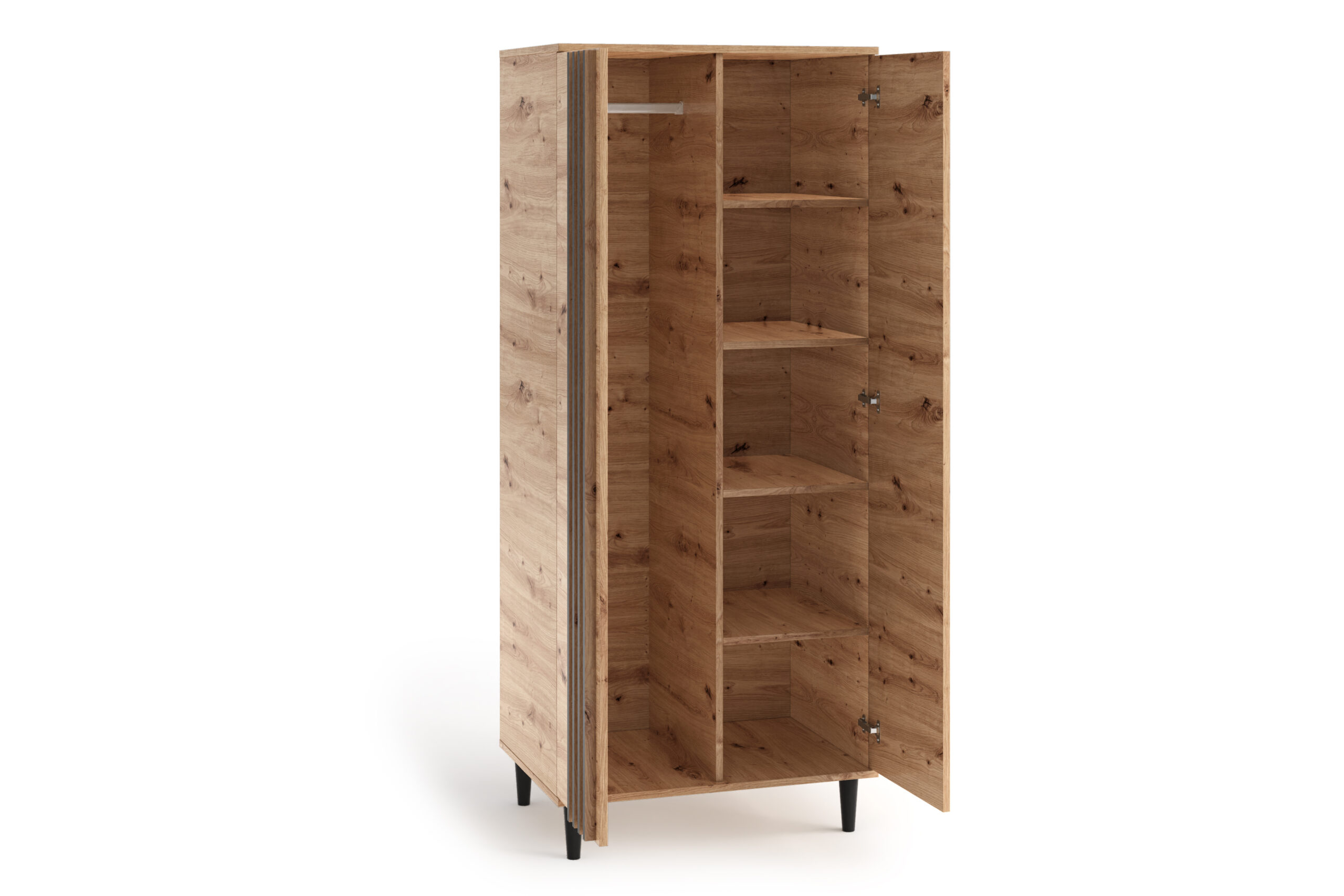 A LIVIA kollekció kétdzwiowa szekrénye tökéletes választás lehet a nappaliba, hálószobába vagy előszobába. Kényelmes tárolóhelyet biztosít. A ruháknak szánt rúddal és a tágas polcokkal könnyen rendet lehet tartani a szobában. A természetes fa hatását hangsúlyozzák a fekete színű díszítőelemek és betétek. A modern stílusban megtervezett szekrény biztosan felkelti a figyelmet. Egyszerű, ugyanakkor funkcionális. Ösztönözzük Önt, hogy ismerkedjen meg a LIVIA kollekció többi termékével is.