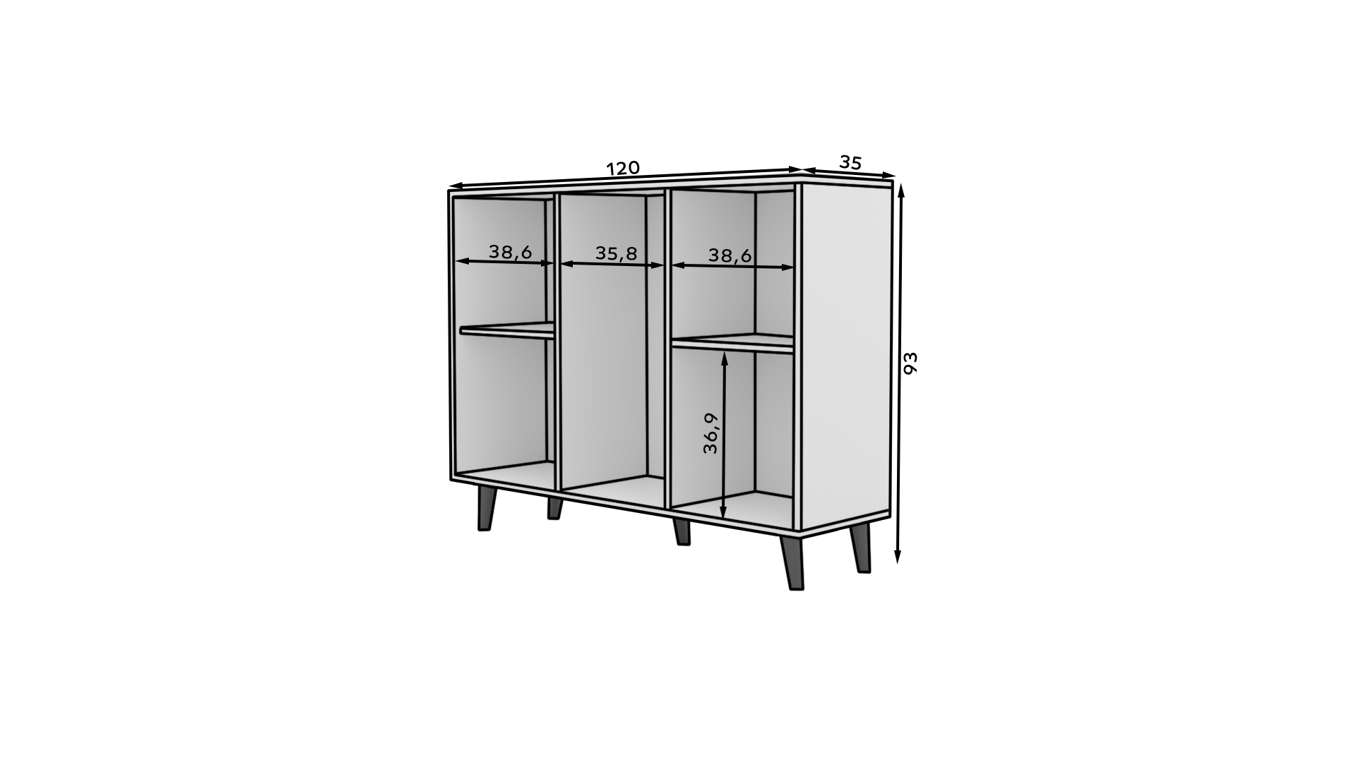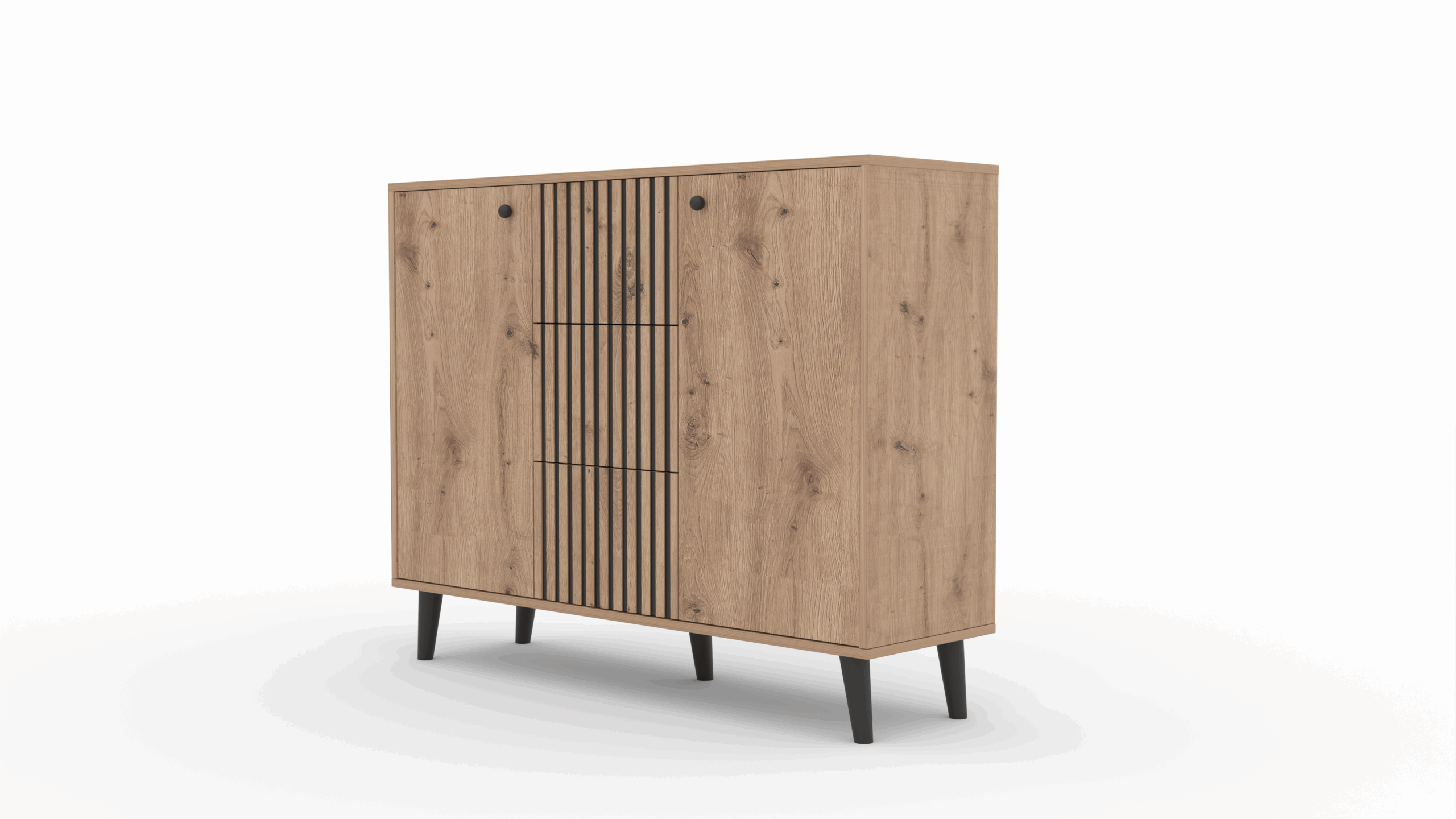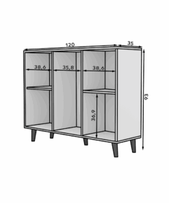 Az IKA komód a minimalista design és a könnyed forma tökéletes kombinációja. A bájt a magas falábak adják hozzá, amelyeknek köszönhetően a szerkezet stabil és masszív. A három tágas fiók lehetővé teszi a kisebb tárgyak vagy dokumentumok tárolását, míg a két oldalsó szekrény középen egy polccal további helyet biztosít. Az IKA komód tökéletesen fog működni nappalijában, hálószobájában vagy előszobájában.