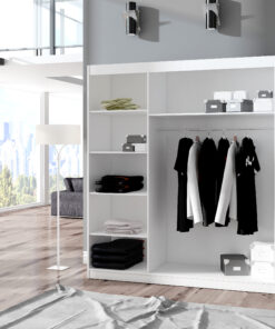 Az SALTO tolóajtós szekrény ideális módja a tér rendszerezésének. A bútor tágas polcokkal és ruhásszárítóval van felszerelve, ahol ruhákat, öltönyöket, külső ruhákat vagy ingeket lehet akasztani. Az elején tükör és jellegzetes ezüstszínű vízszintes csíkok találhatók, amelyek egyedi stílust kölcsönöznek a bútornak. A tolóajtós kivitelének köszönhetően nem szükséges plusz helyet biztosítani az ajtó kinyitásához, így tökéletes megoldás kis szobákhoz vagy keskeny előszobákhoz. Érdekes előnye az esztétikus LED világítás, amely varázslatos bájt kölcsönöz mind a szekrénynek, mind a helyiségnek.