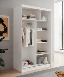 A Lizi 120 cm széles tolóajtós szekrény modern megjelenésű bútordarab, amely ideális választás hálószobába, előszobába vagy gardróbhelyiségbe. Egyszerű, minimalista formája kiválóan illeszkedik a különböző enteriőr stílusokhoz – a modern dizájntól egészen a klasszikusabb berendezésekig. A korpus és az előlapok tartós, 16 mm vastag laminált lapból készültek, ami szilárd szerkezetet és mindennapi használat során is hosszú élettartamot biztosít. A tolóajtós rendszer lehetővé teszi a kényelmes ajtónyitást még szűkebb helyeken is, így ez a szekrény kiválóan használható kisebb helyiségekben is. A szekrény funkcionális belső kialakítása polcokkal és ruhatartó rúddal biztosítja a megfelelő tárolóhelyet ruhák, cipők és kiegészítők számára. A belső tér átgondolt elrendezésének köszönhetően a gardrób rendszerezése egyszerűbbé és hatékonyabbá válik.