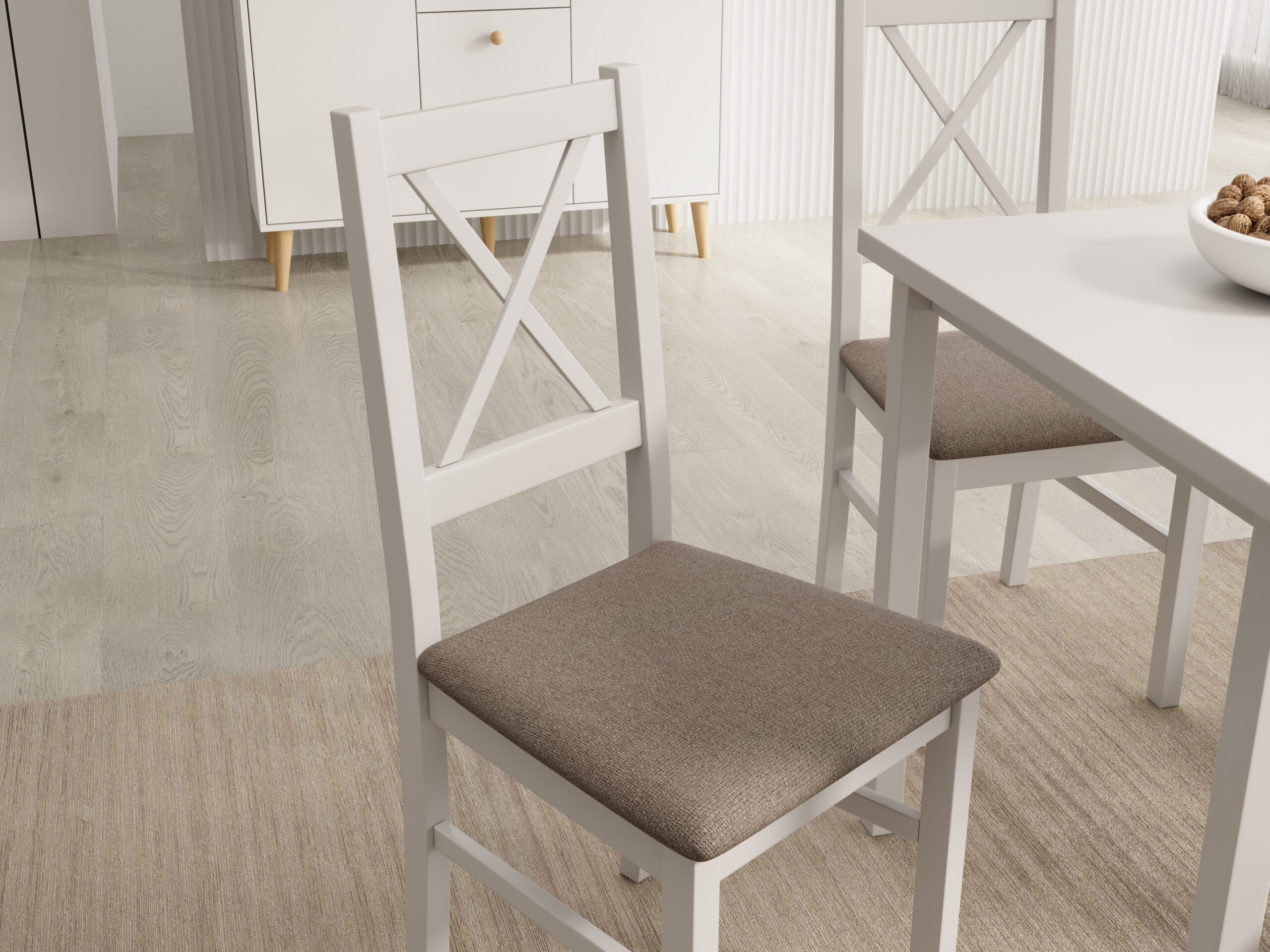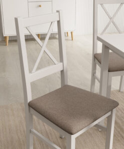 A Milo X szék a rusztikus stílus egyszerűségének és bájának ötvözete a forma és a kényelem modern megközelítésével. Jellegzetes, keresztmintás háttámlája könnyedséget és friss vizuális hatást kölcsönöz neki, így különleges hangsúlyt ad minden étkező- vagy konyhai térnek. A kárpitozott ülőfelület még hosszabb használat során is kényelmet biztosít, míg a stabil, fa szerkezet a szilárdságot és a hosszú élettartamot garantálja. A Milo X tökéletesen illik a skandináv, klasszikus vagy provanszi stílus által ihletett enteriőrökbe, otthonosságot és természetes jelleget adva nekik. Ez egy olyan szék, amely finoman ötvözi az esztétikumot a funkcionalitással, és tökéletesen megfelel az otthoni tér mindennapi igényeinek.