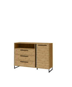 Az ARIA kollekció komódja egy nappaliba, hálószobába vagy irodába tervezett bútordarab. A természetes fa hatást fekete színű kiegészítők és betétek hangsúlyozzák. A modern stílusban tartott, biztos, hogy magára vonzza a figyelmet. Egyszerű, mégis funkcionális. Javasoljuk, hogy ismerkedjen meg az ARIA kollekció többi termékével is.