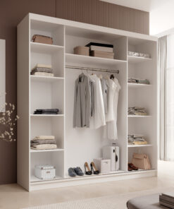 A Sonic 200 tükrös tolóajtós szekrény egy modern és funkcionális bútordarab, amely ideális hálószobába, gardróbba vagy előszobába. Tolóajtói megkönnyítik a mindennapi használatot, és segítenek helyet megtakarítani a helyiségben. A középen elhelyezett nagy tükör nemcsak optikailag növeli a teret, hanem praktikus szerepet is betölt: megkönnyíti a reggeli készülődést és az indulás előtti utolsó ellenőrzést. A Sonic szekrény az esztétikumot és a praktikumot ötvözi, tágas belső terében polcok és ruhatartó rúd található, így kiváló választás a modern enteriőrökbe