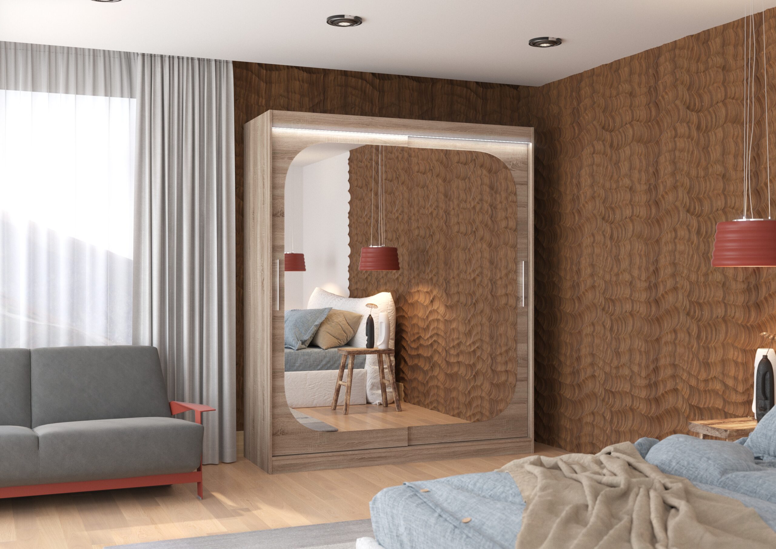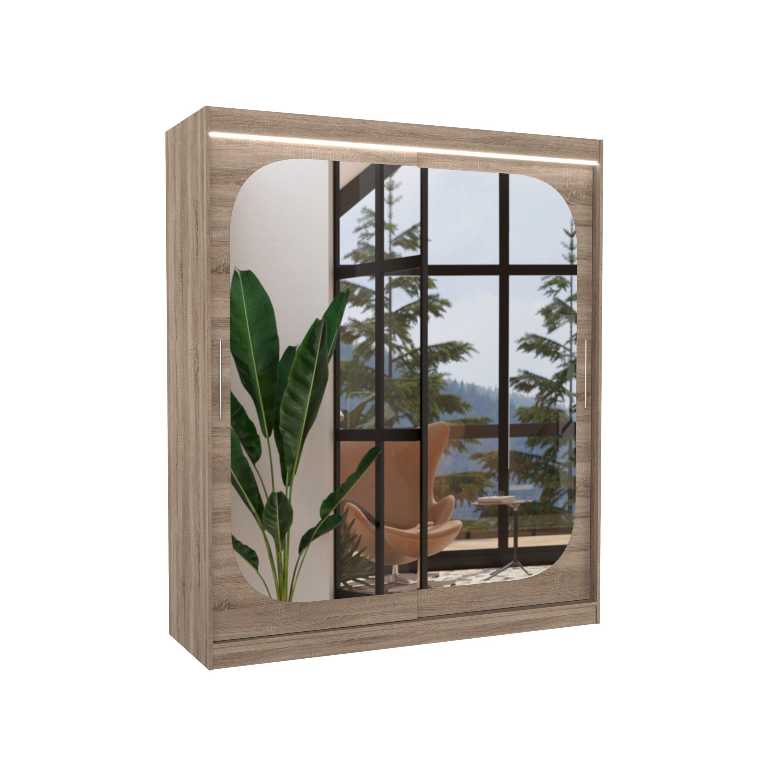 Az ARIZONA tolóajtós tükrös szekrény ideális módja a térrendezésnek. A bútor tágas polcokkal és ruhásszárítóval van felszerelve, ahol ruhákat, öltönyöket, külső ruhákat vagy ingeket lehet akasztani. Az elején tükröket rögzítettek, amelyek optikailag nagyítják a teret. A tolóajtós kialakításnak köszönhetően nem szükséges plusz helyet biztosítani az ajtók kinyitásához, így tökéletes megoldás kis hálószobákhoz vagy keskeny előszobákhoz. Érdekes előnye az esztétikus LED világítás, amely varázslatos bájt kölcsönöz mind a szekrénynek, mind a helyiségnek.