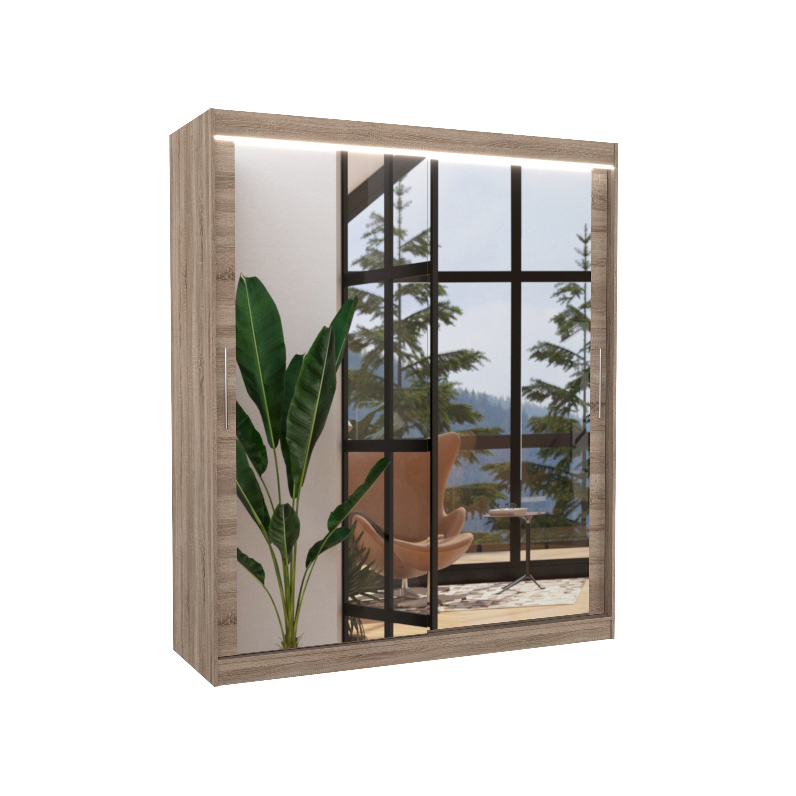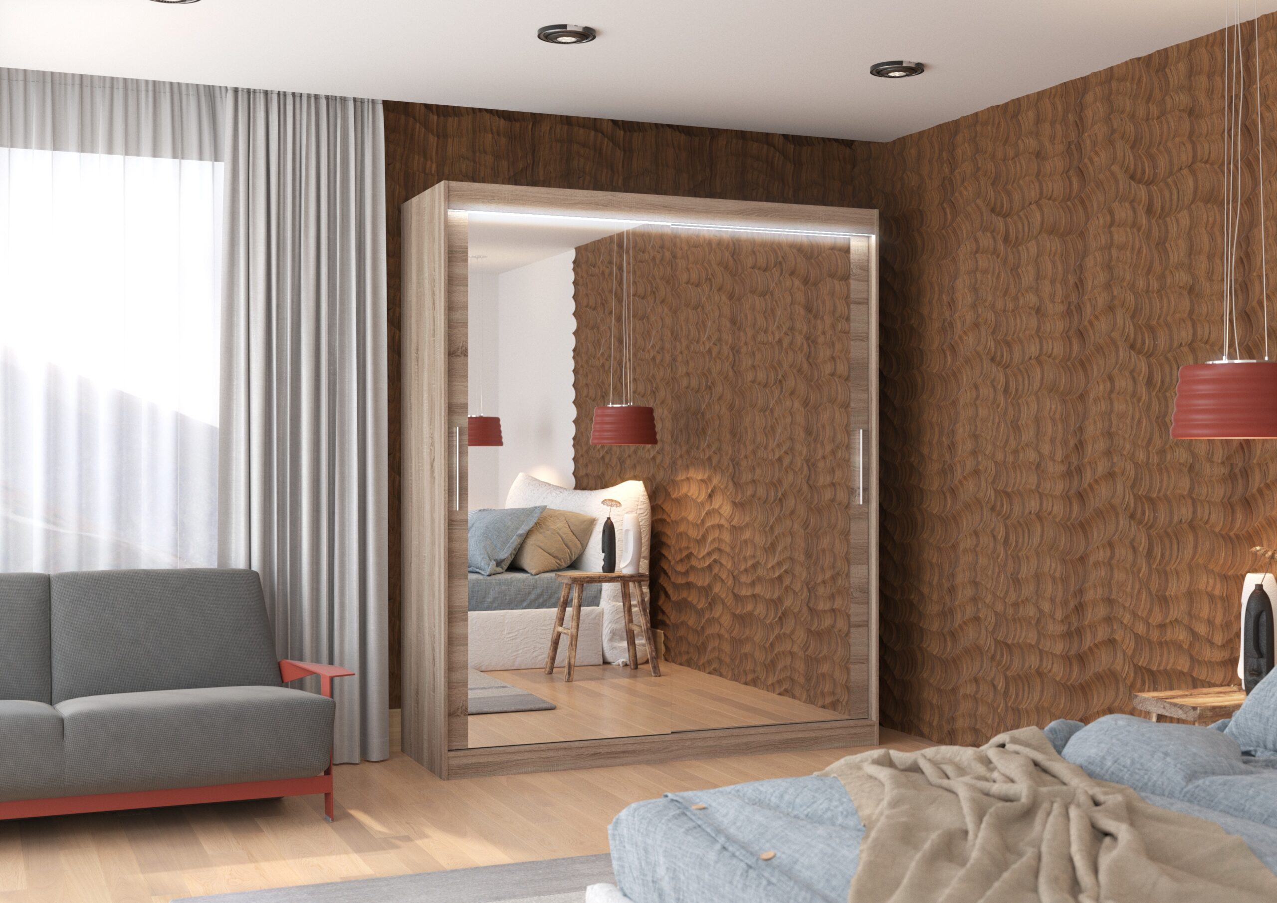 Az ETTORE tolóajtós tükrös szekrény ideális módja a térrendezésnek. A bútor tágas polcokkal és ruhásszárítóval van felszerelve, ahol ruhákat, öltönyöket, külső ruhákat vagy ingeket lehet akasztani. Az elején tükröket rögzítettek, amelyek optikailag nagyítják a teret. A tolóajtós kialakításnak köszönhetően nem szükséges plusz helyet biztosítani az ajtók kinyitásához, így tökéletes megoldás kis hálószobákhoz vagy keskeny előszobákhoz. Érdekes előnye az esztétikus LED világítás, amely varázslatos bájt kölcsönöz mind a szekrénynek, mind a helyiségnek.