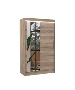 A „BARIO” tolóajtós gardrób tükörrel ideális módja a térrendezésnek. A bútor nagy tárolópolcokkal és ruhásszekrénnyel van ellátva, ahol felakaszthatja ruháit, öltönyeit, kabátjait és ingeit. Az előlapra egy tükör van rögzítve, ami vizuálisan megnöveli a teret. A tolóajtós kialakításnak köszönhetően nem szükséges plusz helyet fenntartani az ajtók kinyitásához, így kiváló megoldás kis szobákhoz vagy keskeny előszobákhoz. Egy másik vonzó jellemzője az effektív LED világítás, amely varázslatos bájt kölcsönöz mind a szekrénynek, mind a szobának.