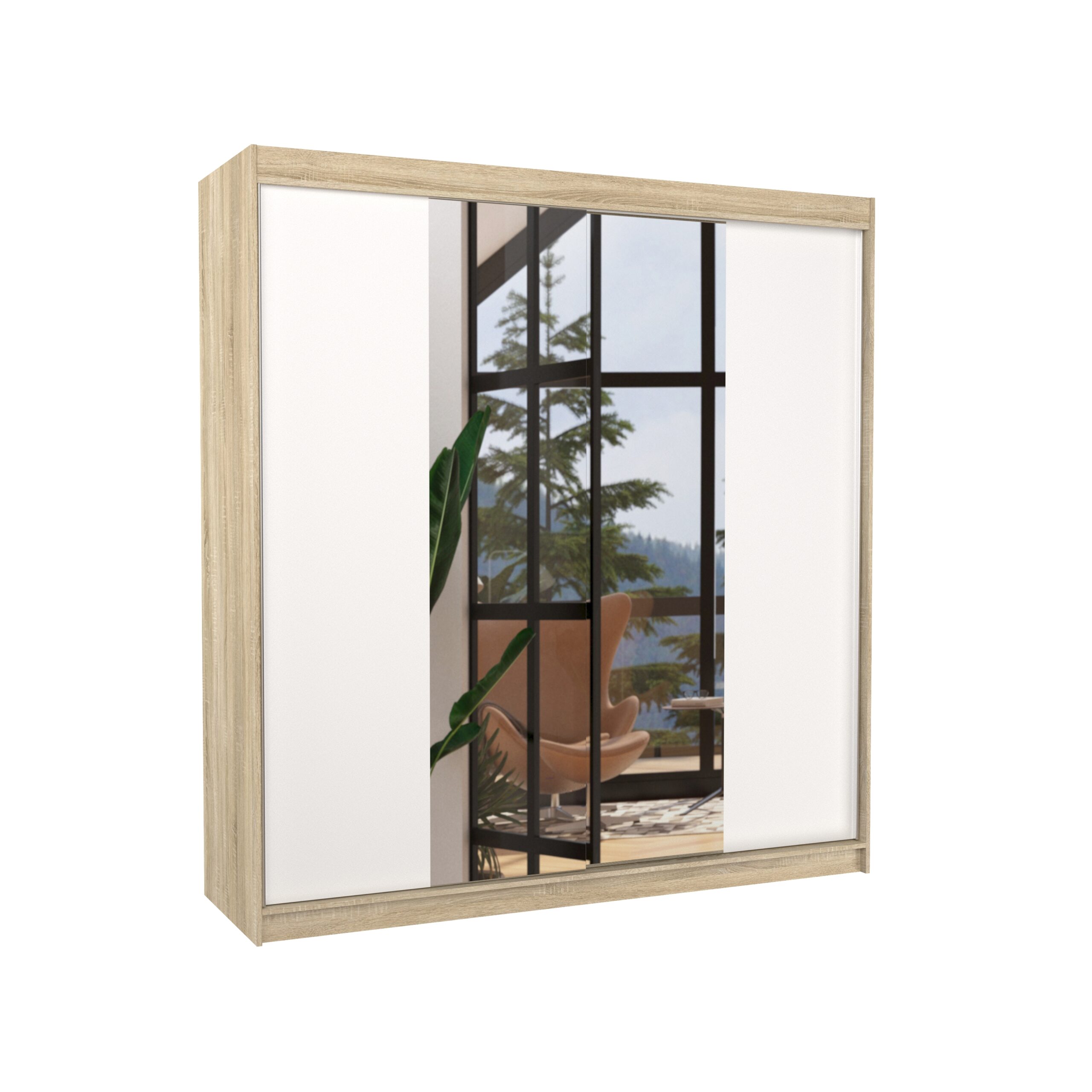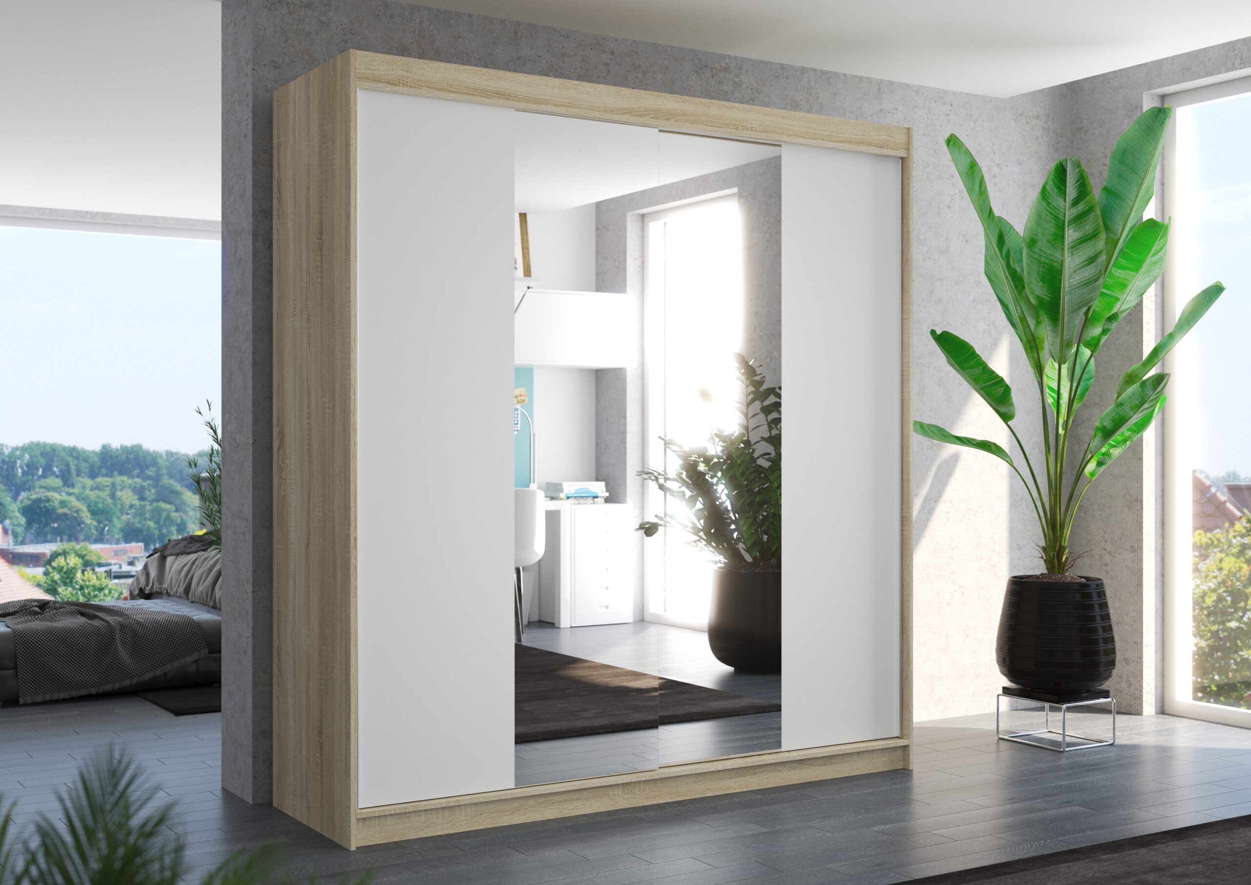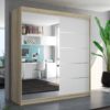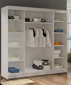 A PERQS tolóajtós gardróbszekrény ideális megoldás a térrendezéshez. A bútor tágas polcokkal és ruhásszekrénnyel van felszerelve, ahol ruhákat, öltönyöket, külső ruházatot vagy ingeket lehet felakasztani. Az előlapon elhelyezett tükrök optikailag nagyítják a teret. A tolóajtós kialakításának köszönhetően nem kell külön helyet szentelni a nyitáshoz, ezért tökéletes választás kis szobákba vagy keskeny előszobákba is.