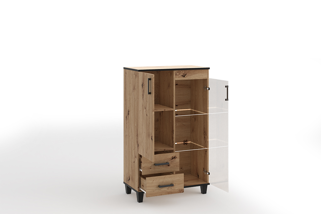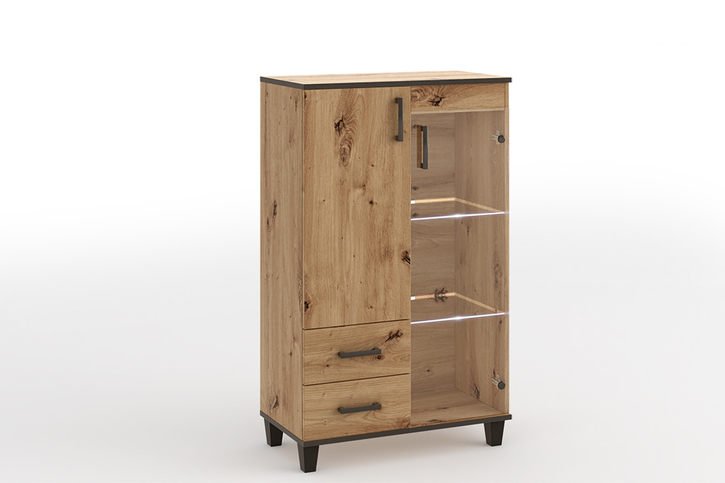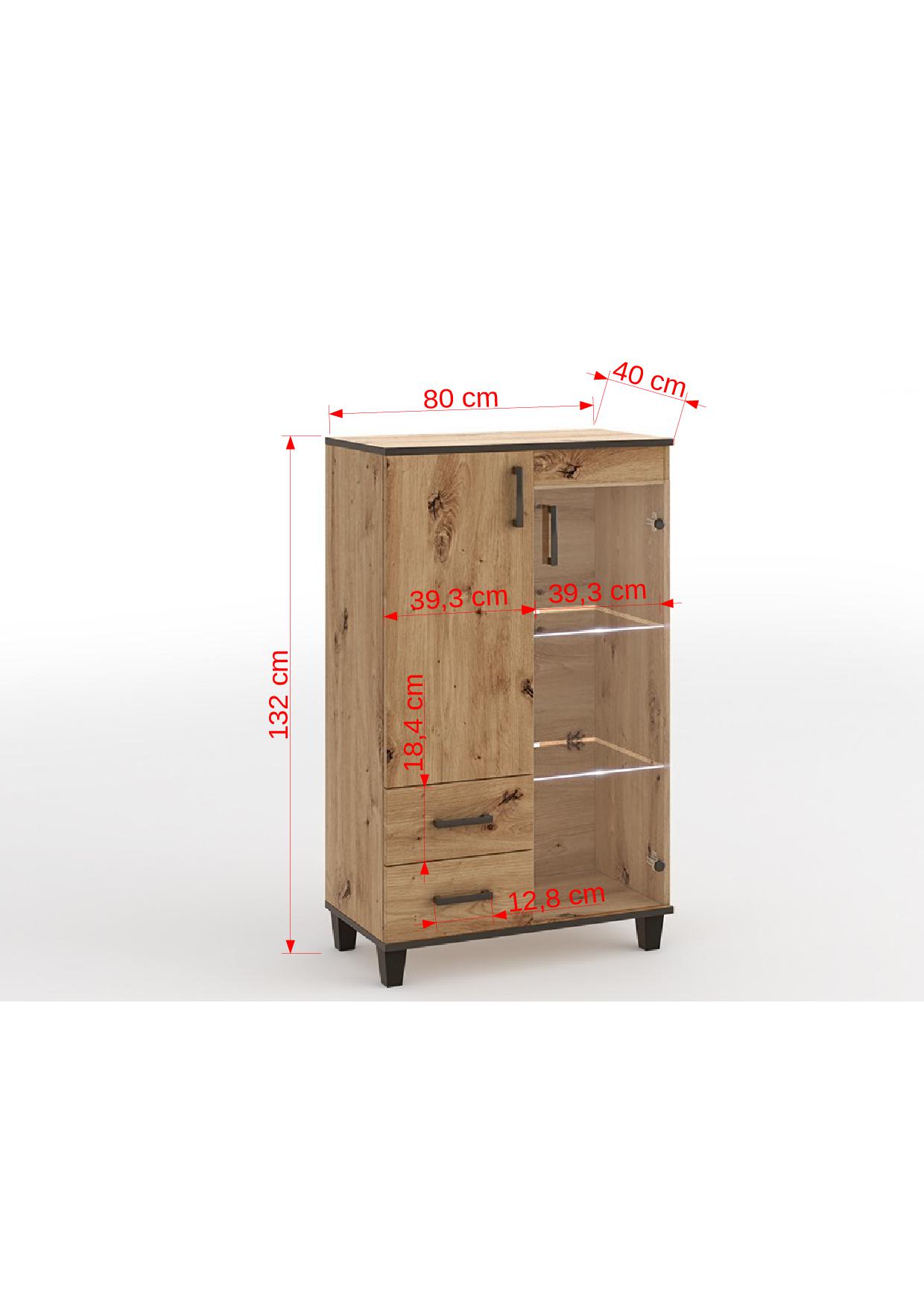A POLA kollekció vitrinszekrénye modern stílusban tartott, biztosan felkelti a figyelmet. A természetes fa hatását fekete színű kiegészítők és betétek hangsúlyozzák. Az üvegajtók mögött két mély polc található, amelyek lehetővé teszik az értékes emlékek vagy családi fényképek bemutatását, míg a tágas szekrény és fiókok további tárolóhelyet biztosítanak. Ajánljuk, hogy ismerkedjen meg a POLA kollekció többi elemével is.
