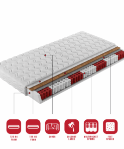 A DAKO zsebrugós matracban nagy mennyiségű rugót használtak, így tökéletesen illeszkedik a testhez és megfelelően támogatja azt, segítve a helyes testtartás fenntartását. Nagy rugalmassága miatt a DAKO matrac ellenáll az alakváltozásoknak, így nagyon hosszú ideig tartó használatra alkalmas. A matrac töltése magas minőségű T25 típusú poliuretán habból készült, amelynek H5 és H4 keménységi fokozatai vannak – nagyon kemény és extra kemény. A DAKO modell kényelmének növelése érdekében 1 cm vastag kókuszlapot kapott. Ez a kombináció biztosítja a matrac jó tartósságát és levegőcirkulációját. Fontos jellemzője továbbá a hypoallergén tulajdonságokkal rendelkező antiallergén, steppezett huzat, amely nem vonzza a port, atkákat és más allergéneket, így nagy népszerűségnek örvend az allergiás reakciókra hajlamos és bőrirritációra érzékeny emberek körében. Emellett 40 fokos vízben mosható, ami még inkább megkönnyíti az alvás higiéniájának fenntartását. A huzat cipzárral ellátott, így könnyen le- és felhúzható.